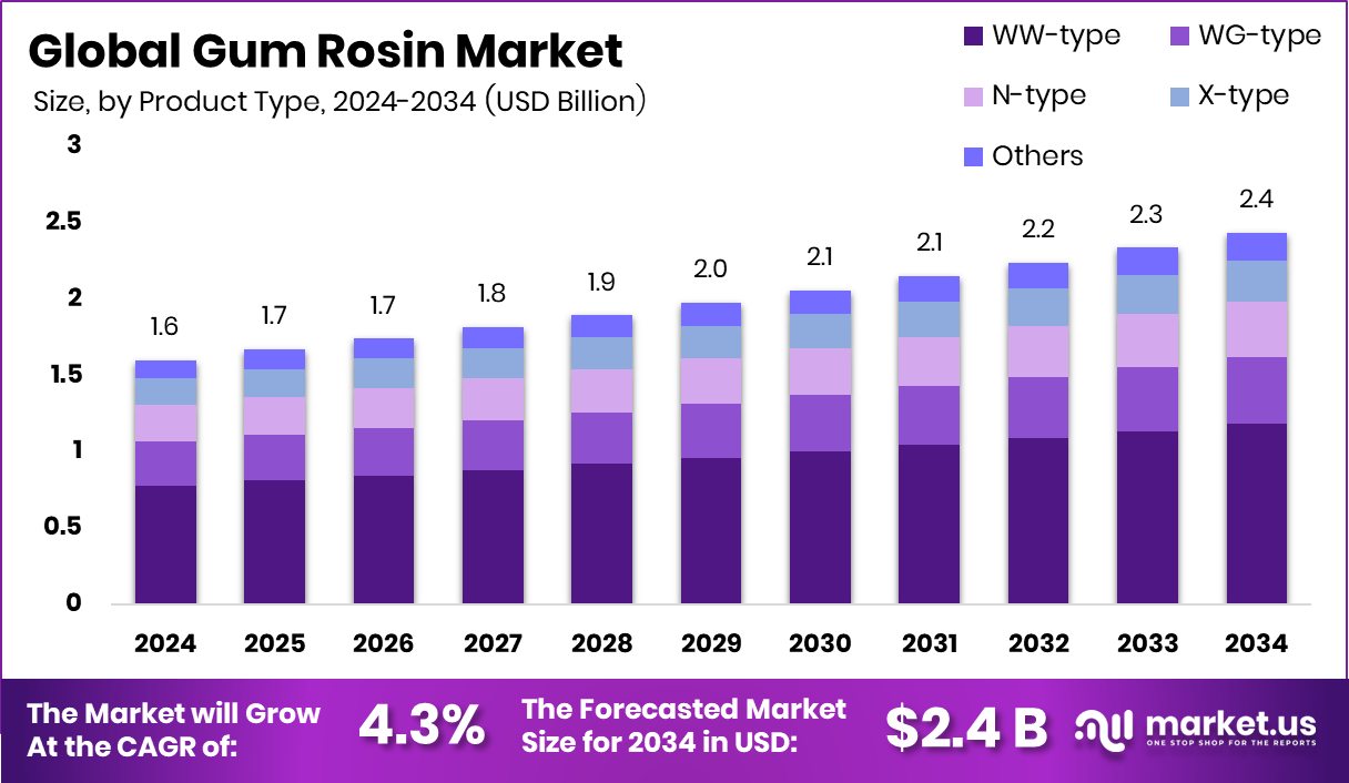 - Global Gum Rosin Market is expected to be worth around USD 2.4 billion by 2034, up from USD 1.6 billion in 2024, and grow at a CAGR of 4.3% from 2025 to 2034.