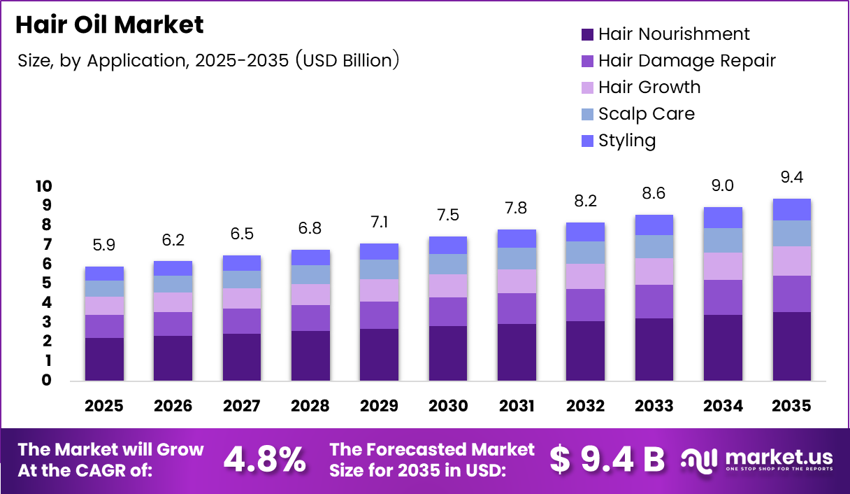 Global Hair Oil Market size is expected to be worth around USD 9.4 Billion by 2035 from USD 5.9 Billion in 2025, growing at a CAGR of 4.8% during the forecast period 2026 to 2035.