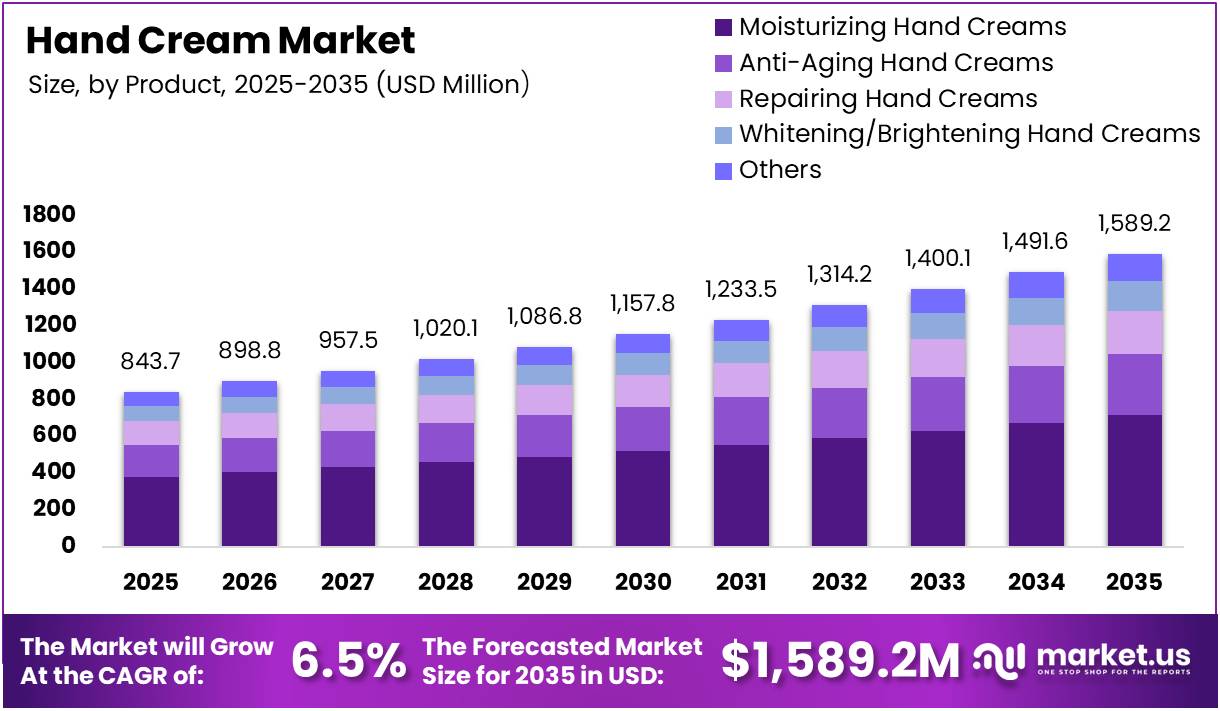The Global Hand Cream Market size is expected to be worth around USD 1,589.2 Million by 2035 from USD 843.7 Million in 2025, growing at a CAGR of 6.5% during the forecast period 2026 to 2035.