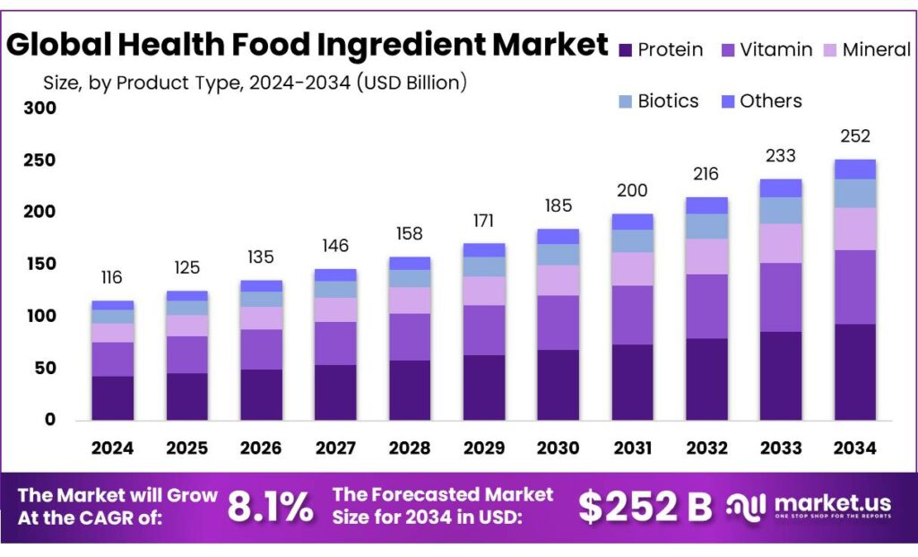 - Health Food Ingredient Market is expected to be worth around USD 252 Billion by 2034, up from USD 116 Billion in 2024, and is projected to grow at a CAGR of 8.1%.