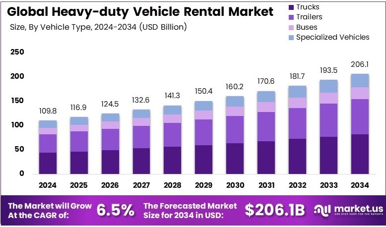 The Global Heavy-duty Vehicle Rental Market size is expected to be worth around USD 206.1 Billion by 2034, from USD 109.8 Billion in 2024, growing at a CAGR of 6.5% during the forecast period from 2025 to 2034.