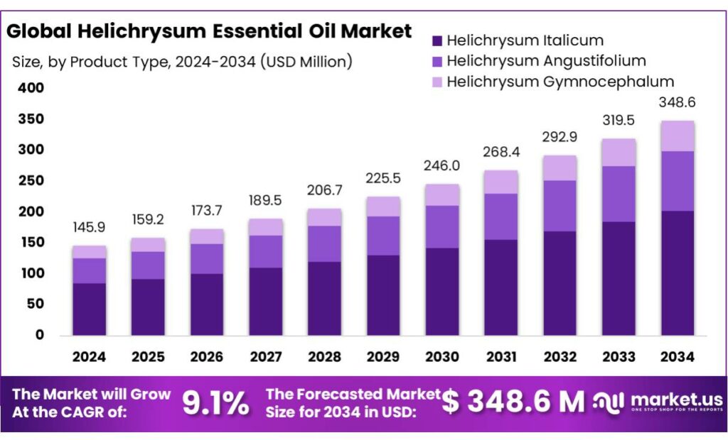 - Helichrysum Essential Oil Market size is expected to be worth around USD 348.6 Million by 2034, from USD 145.9 Million in 2024, growing at a CAGR of 9.1%.