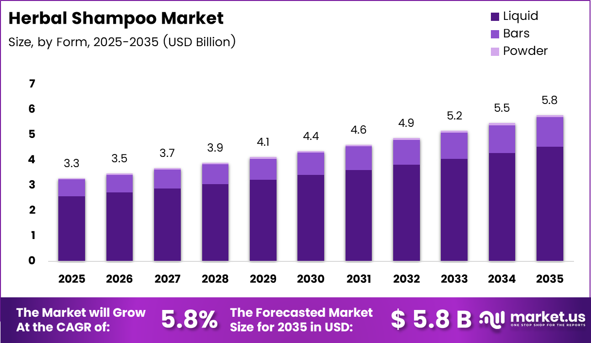 Global Herbal Shampoo Market size is expected to be worth around USD 5.8 Billion by 2035 from USD 3.3 Billion in 2025, growing at a CAGR of 5.8% during the forecast period 2026 to 2035.