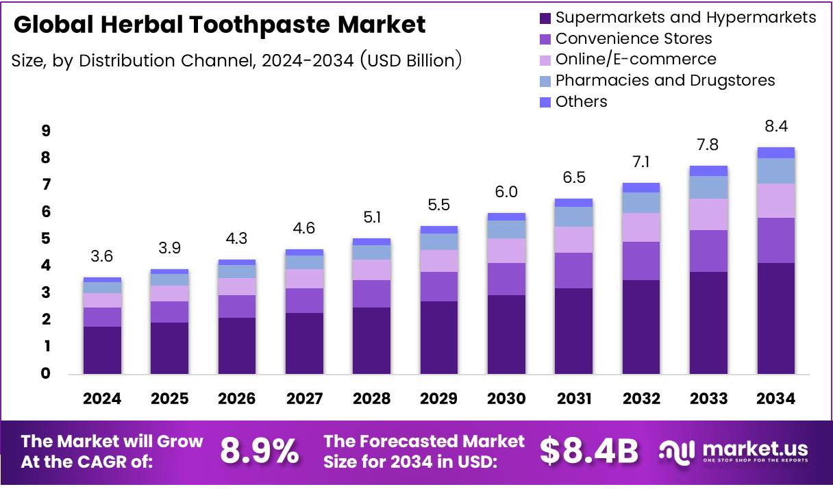 - Global Herbal Toothpaste Market is projected to reach USD 8.4 Billion by 2034, growing from USD 3.6 Billion in 2024 at a CAGR of 8.9% (2025–2034).