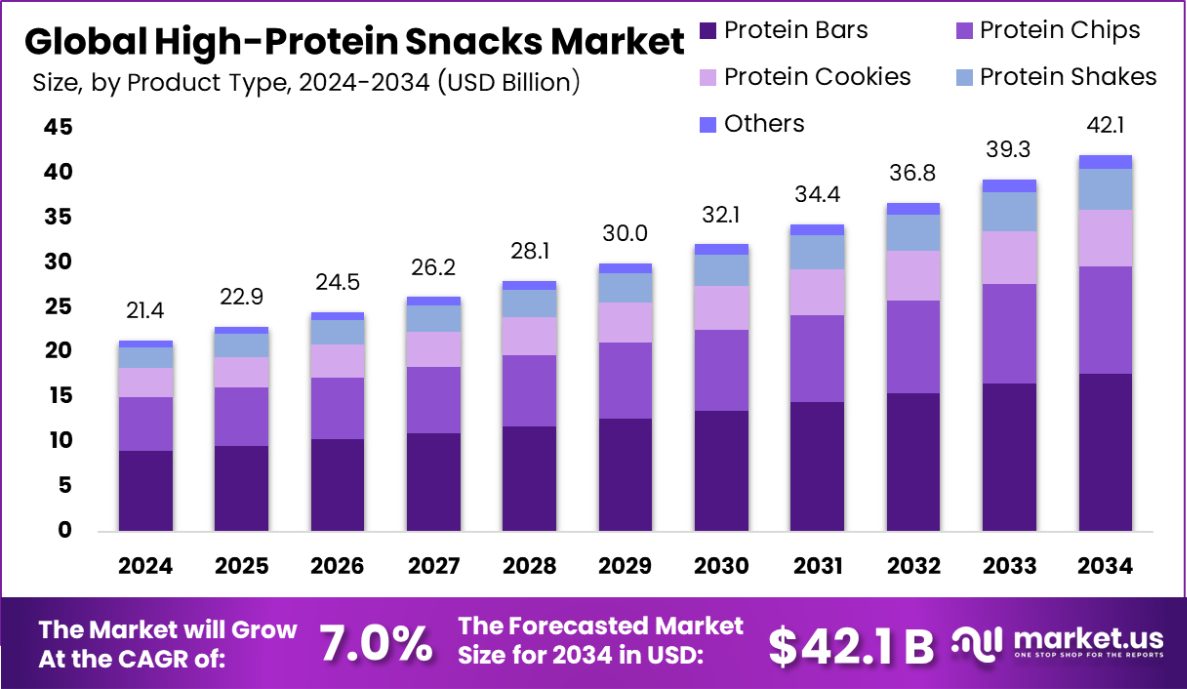 - Global High-Protein Snacks Market is expected to be worth around USD 42.1 billion by 2034, up from USD 21.4 billion in 2024, and grow at a CAGR of 7.0% from 2025 to 2034.