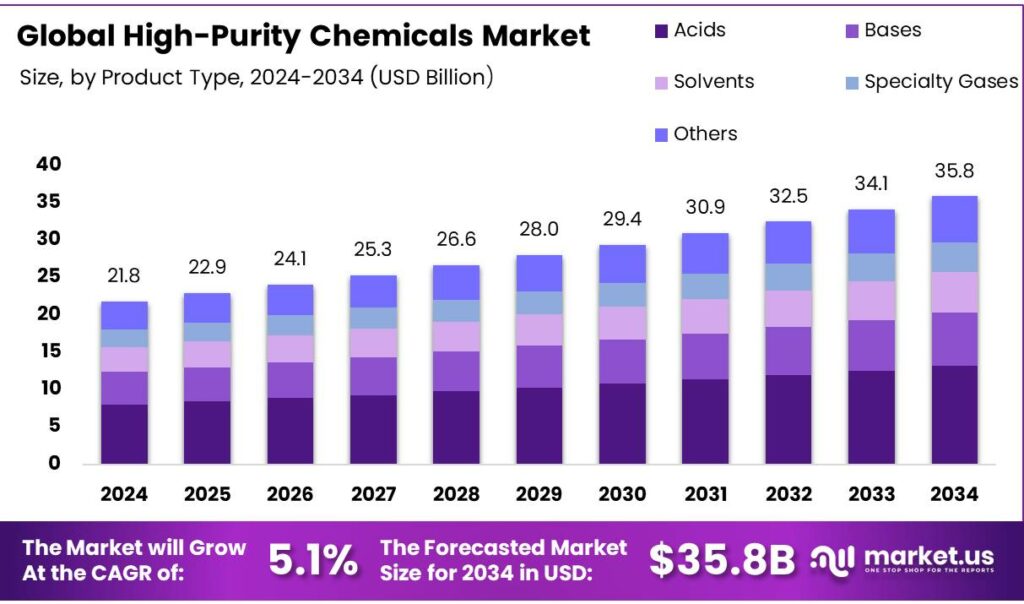 - The global high-purity chemicals market is projected to grow at a CAGR of 5.1% and is estimated to reach USD 35.8 billion by 2034.