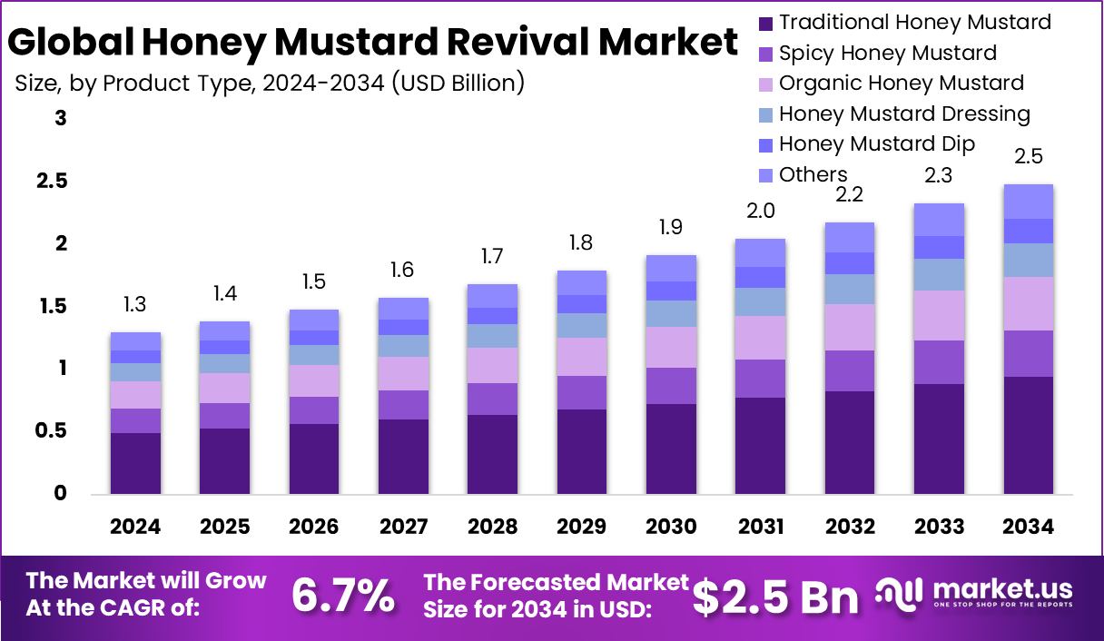- Global Honey Mustard Revival Market is expected to be worth around USD 2.5 billion by 2034, up from USD 1.3 billion in 2024, and grow at a CAGR of 6.7% from 2025 to 2034.
