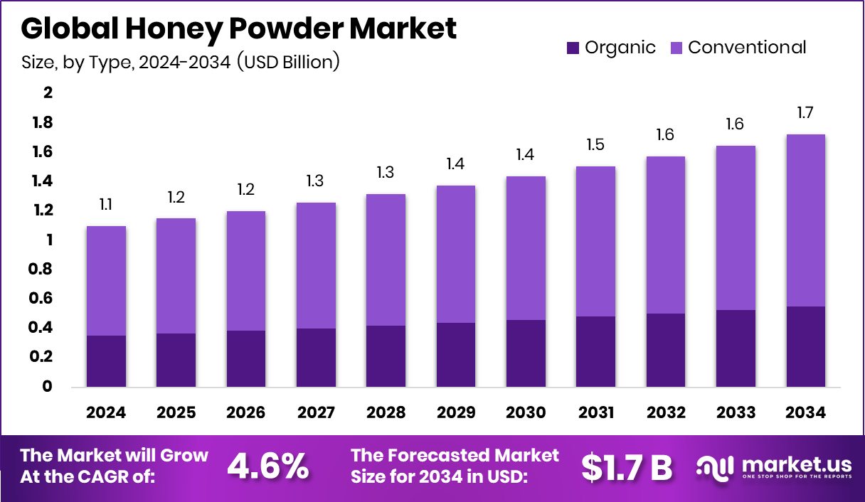 - The Global Honey Powder Market is expected to be worth around USD 1.7 billion by 2034, up from USD 1.1 billion in 2024, and is projected to grow at a CAGR of 4.6% from 2025 to 2034.
