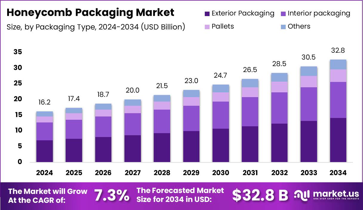The Global Honeycomb Packaging Market size is expected to be worth around USD 32.8 Billion by 2034, from USD 16.2 Billion in 2024, growing at a CAGR of 7.3% during the forecast period from 2025 to 2034.