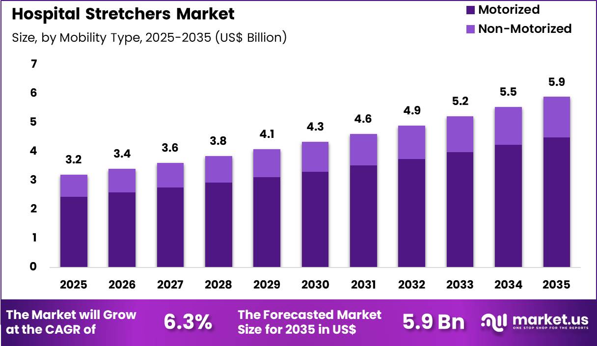 The Global Hospital Stretchers Market size is expected to be worth around US$ 5.9 Billion by 2035 from US$ 3.2 Billion in 2025, growing at a CAGR of 6.3% during the forecast period 2026-2035. In 2025, North America led the market, achieving over 34.4% share with a revenue of US$ 1.1 Billion.