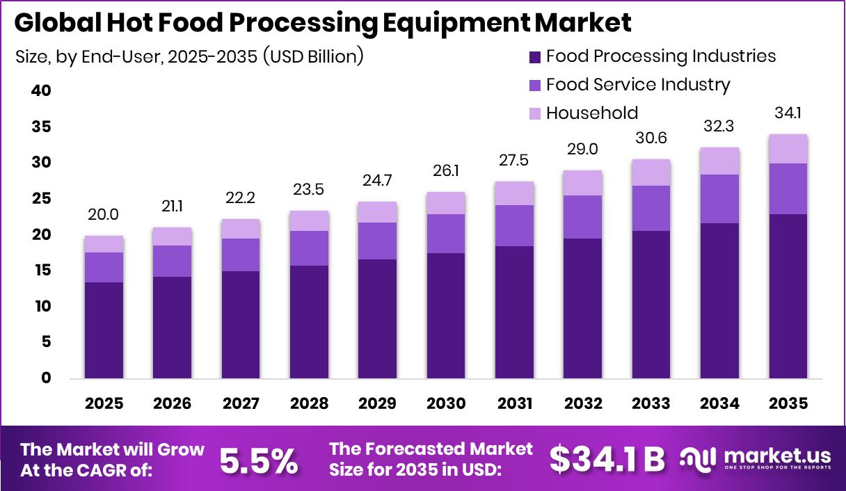 - The Global Hot Food Processing Equipment Market is expected to be worth around USD 34.1 billion by 2035, up from USD 20.0 billion in 2025. It is projected to grow at a CAGR of 5.5% from 2026 to 2035.