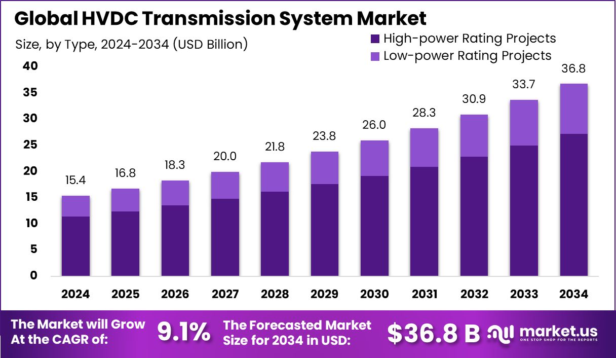 - Global HVDC Transmission System Market is expected to be worth around USD 36.8 billion by 2034, up from USD 15.4 billion in 2024, and grow at a CAGR of 9.1% from 2025 to 2034.