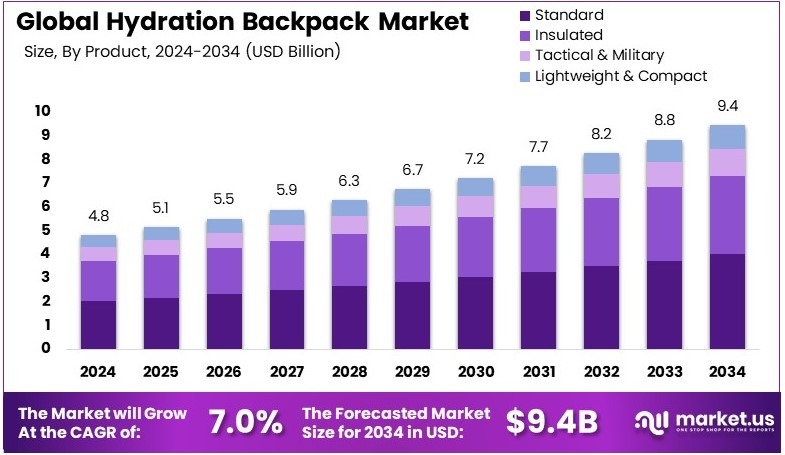 - Hydration Backpack Market was valued at USD 4.8 Billion in 2024 and is expected to reach USD 9.4 Billion by 2034, with a CAGR of 7.0%.
