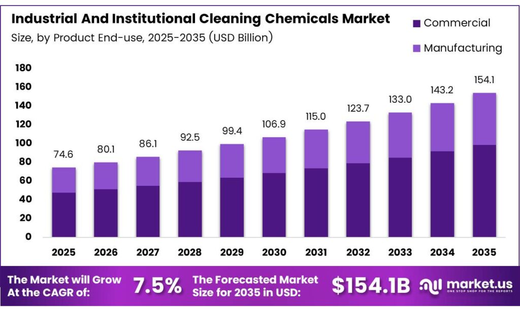 The Global Industrial and Institutional Cleaning Chemicals Market size is expected to be worth around USD 154.1 billion by 2035 from USD 74.6 billion in 2025, growing at a CAGR of 7.5% during the forecast period 2026 to 2035.