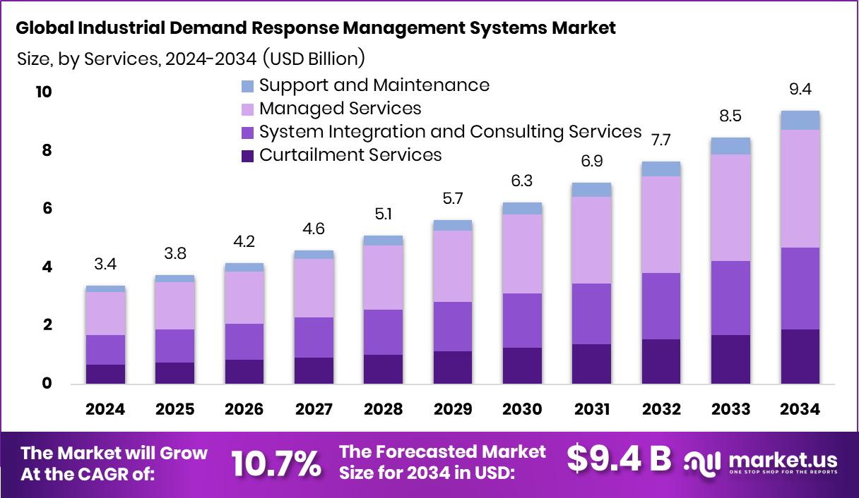 - The Global Industrial Demand Response Management Systems Market is expected to be worth around USD 9.4 billion by 2034, up from USD 3.4 billion in 2024, and is projected to grow at a CAGR of 10.7% from 2025 to 2034.