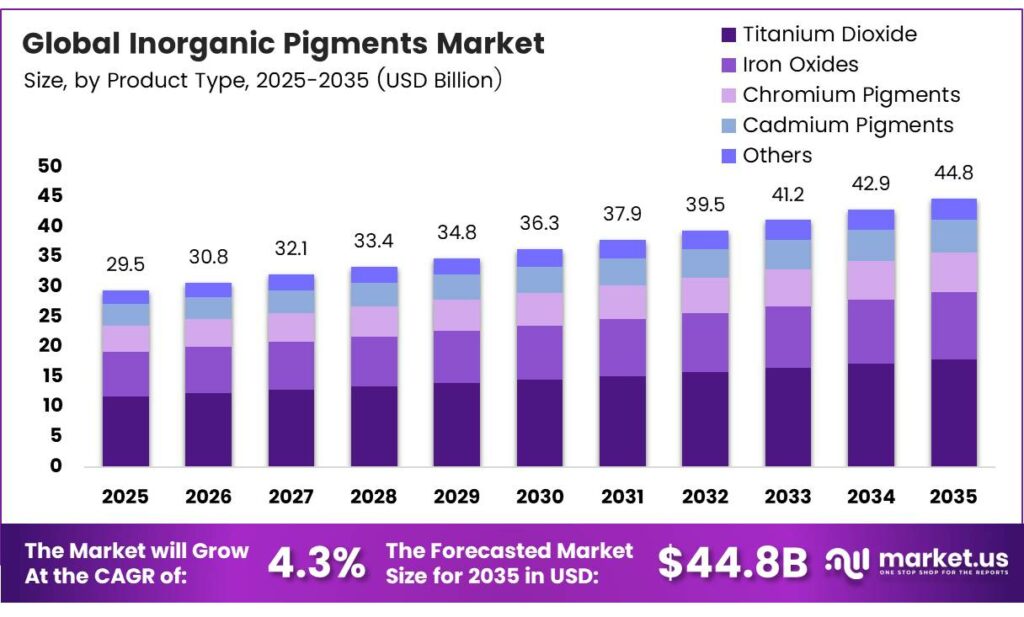 The Global Inorganic Pigments Market size is expected to be worth around USD 44.8 billion by 2035 from USD 29.5 billion in 2025, growing at a CAGR of 4.3% during the forecast period 2026 to 2035.