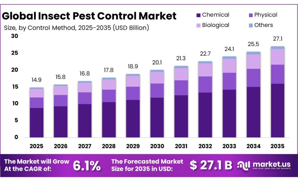 - Insect Pest Control Market size is expected to be worth around USD 27.1 Billion by 2035, from USD 14.9 Billion in 2025, growing at a CAGR of 6.1%.