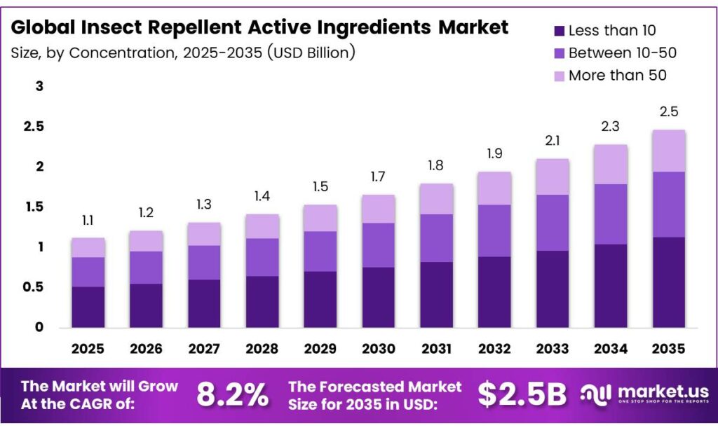 The Global Insect Repellent Active Ingredients Market size is expected to be worth around USD 2.5 billion by 2035 from USD 1.1 billion in 2025, growing at a CAGR of 8.2% during the forecast period 2026 to 2035.