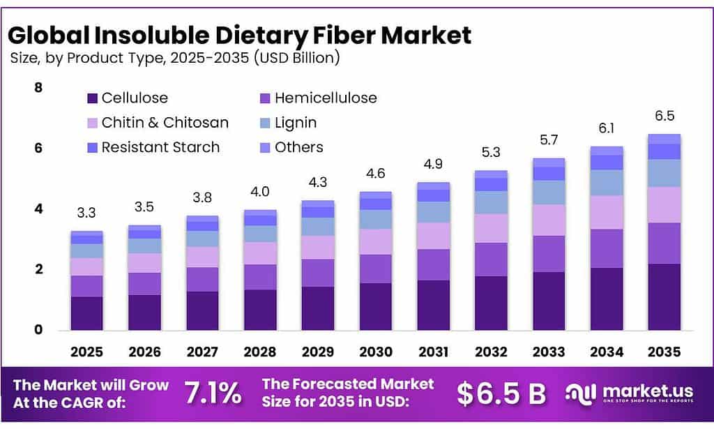 - Insoluble Dietary Fiber Market size is expected to be worth around USD 6.5 Billion by 2035, from USD 3.3 Billion in 2025, growing at a CAGR of 7.1%.