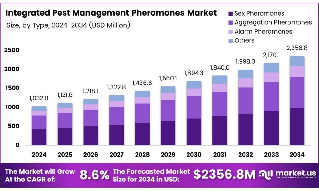 - The Global Integrated Pest Management Pheromones Market is valued at USD 1,032.8 million in 2024 to reach USD 2,356.8 million by 2034, growing at a CAGR of 8.6%.