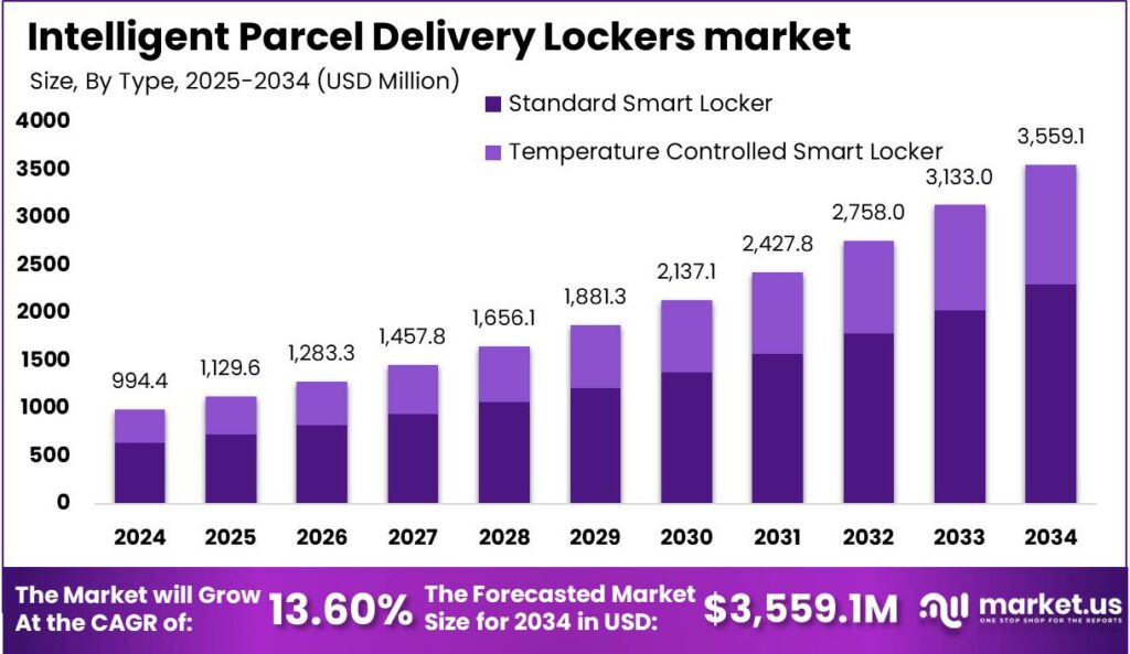 - The Global Intelligent Parcel Delivery Lockers market is expected to reach USD 3,559.1 Million by 2034, up from USD 994.4 Million in 2024, growing at a CAGR of 13.60% during the forecast period from 2025 to 2034.