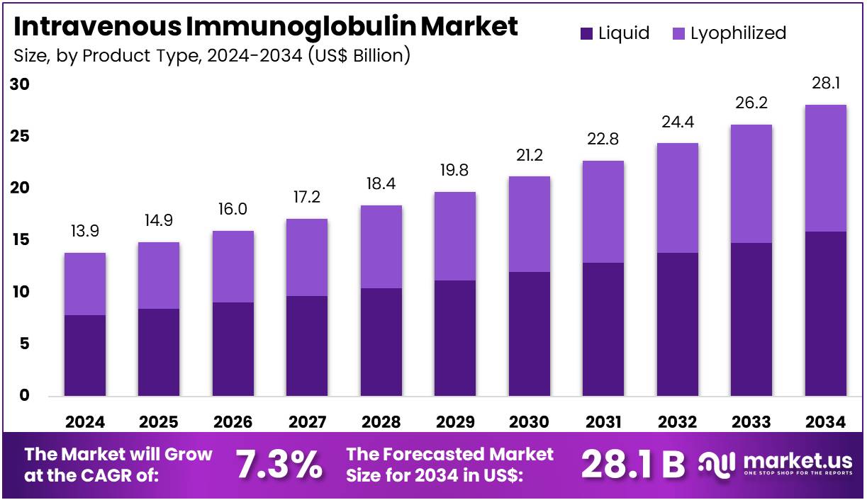 Report Features Description Market Value (2024) US$ 13.9 billion Forecast Revenue (2034) US$ 28.1 billion CAGR (2025-2034) 7.3% Base Year for Estimation 2024 Historic Period 2020-2023 Forecast Period 2025-2034 Report Coverage Revenue Forecast, Market Dynamics, COVID-19 Impact, Competitive Landscape, Recent Developments Segments Covered By Product Type (Liquid and Lyophilized), By Application (Primary Immunodeficiency, Multifocal Motor Neuropathy (MMN), Immune Thrombocytopenic Purpura (ITP), Guillain-Barré Syndrome (GBS), Chronic Inflammatory Demyelinating Polyneuropathy (CIDP), and Others), By End-user (Hospitals, Clinics, and Homecare) Regional Analysis North America – US, Canada; Europe – Germany, France, The UK, Spain, Italy, Russia, Netherlands, Rest of Europe; Asia Pacific – China, Japan, South Korea, India, Australia, New Zealand, Singapore, Thailand, Vietnam, Rest of APAC; Latin America – Brazil, Mexico, Rest of Latin America; Middle East & Africa – South Africa, Saudi Arabia, UAE, Rest of MEA Competitive Landscape Octapharma AG, LFB, Kedrion, Grifols SA, CSL, China Biologics Products Inc., Biotest AG, BDI Pharma Inc., Baxter, Argenx SE. Customization Scope Customization for segments, region/country-level will be provided. Moreover, additional customization can be done based on the requirements. Purchase Options We have three licenses to opt for: Single User License, Multi-User License (Up to 5 Users), Corporate Use License (Unlimited User and Printable PDF)