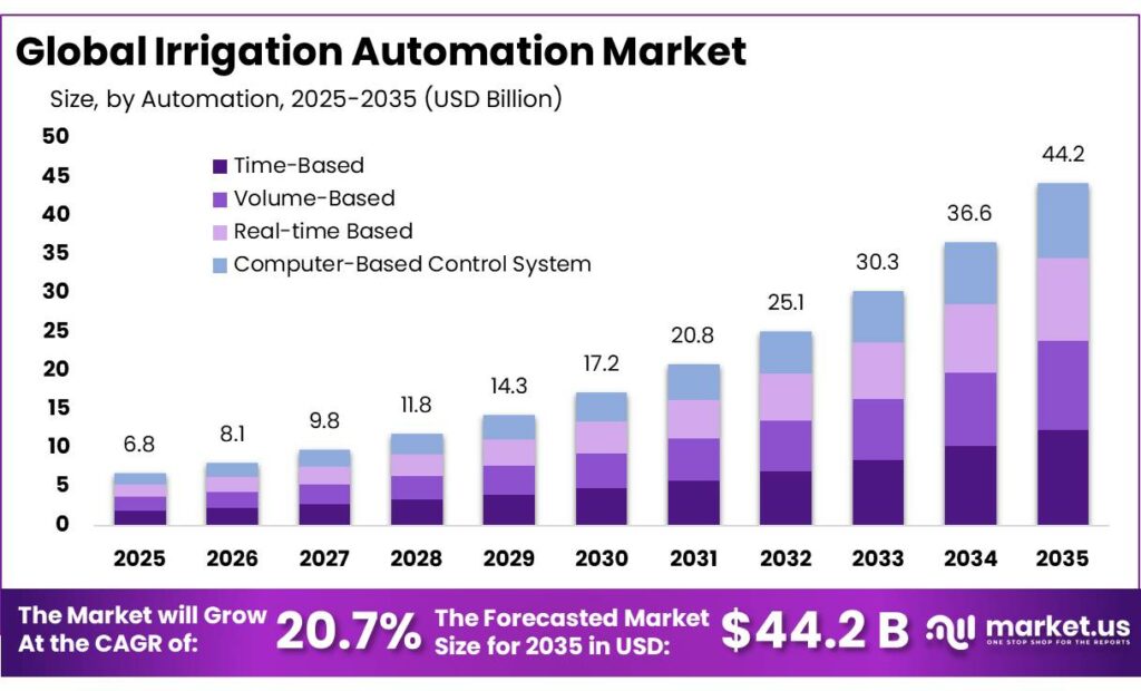 - Irrigation Automation Market size is expected to be worth around USD 44.2 Billion by 2035, from USD 6.8 Billion in 2025, growing at a CAGR of 20.7%