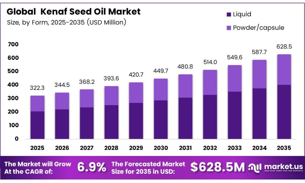 The Global Kenaf Seed Oil Market size is expected to be worth around USD 628.5 Million by 2035 from USD 322.3 Million in 2025, growing at a CAGR of 6.9% during the forecast period 2026 to 2035.