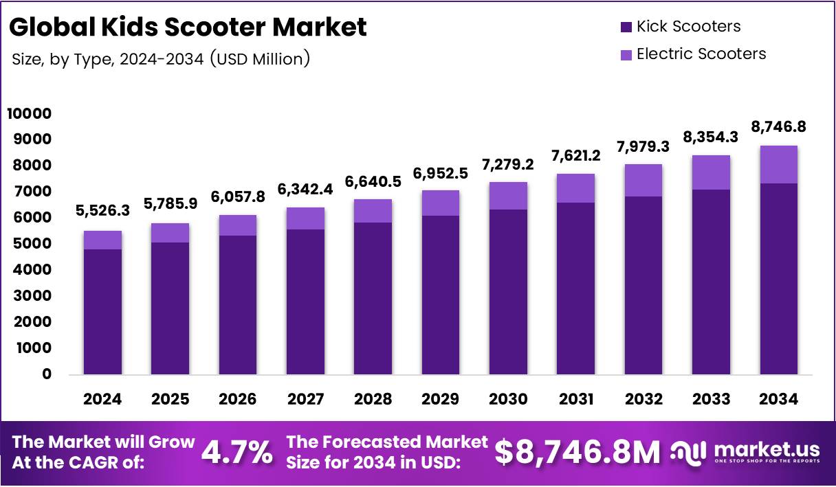 The Global Kids scooter Market size is expected to be worth around USD 8,802.67 Million by 2034, from USD 5,526.25 Million in 2024, growing at a CAGR of 4.7% during the forecast period from 2025 to 2034.