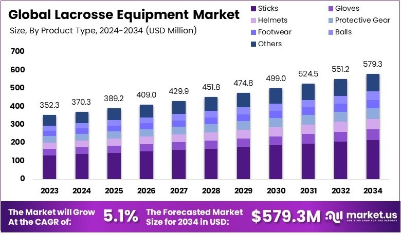 - The Lacrosse Equipment Market was valued at USD 352.3 Million in 2024, and is expected to reach USD 579.3 Million by 2034, with a CAGR of 5.1%.