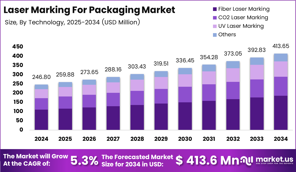 - The global Laser Marking For Packaging Market is projected to reach USD 413.6 million by 2034, expanding from USD 246.8 million in 2024 at a CAGR of 5.3%.