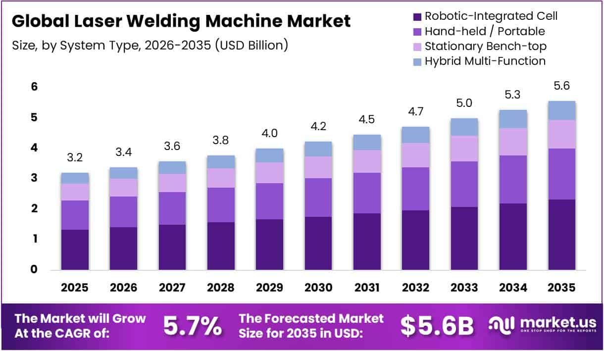 - Global Laser Welding Machine Market projected to reach USD 5.6 Billion by 2035 from USD 3.2 Billion in 2025 at 5.7% CAGR