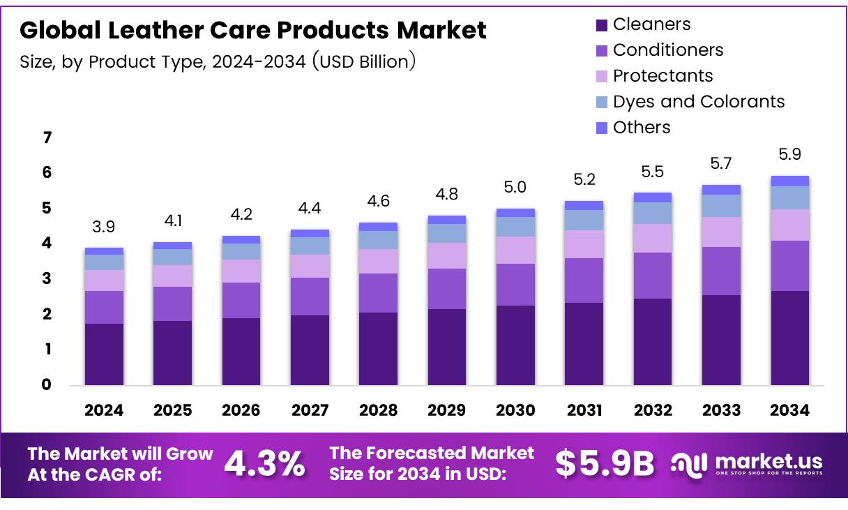 - Global Leather Care Products Market projected to grow from USD 3.9 Billion in 2024 to USD 5.9 Billion by 2034 at a CAGR of 4.3%.