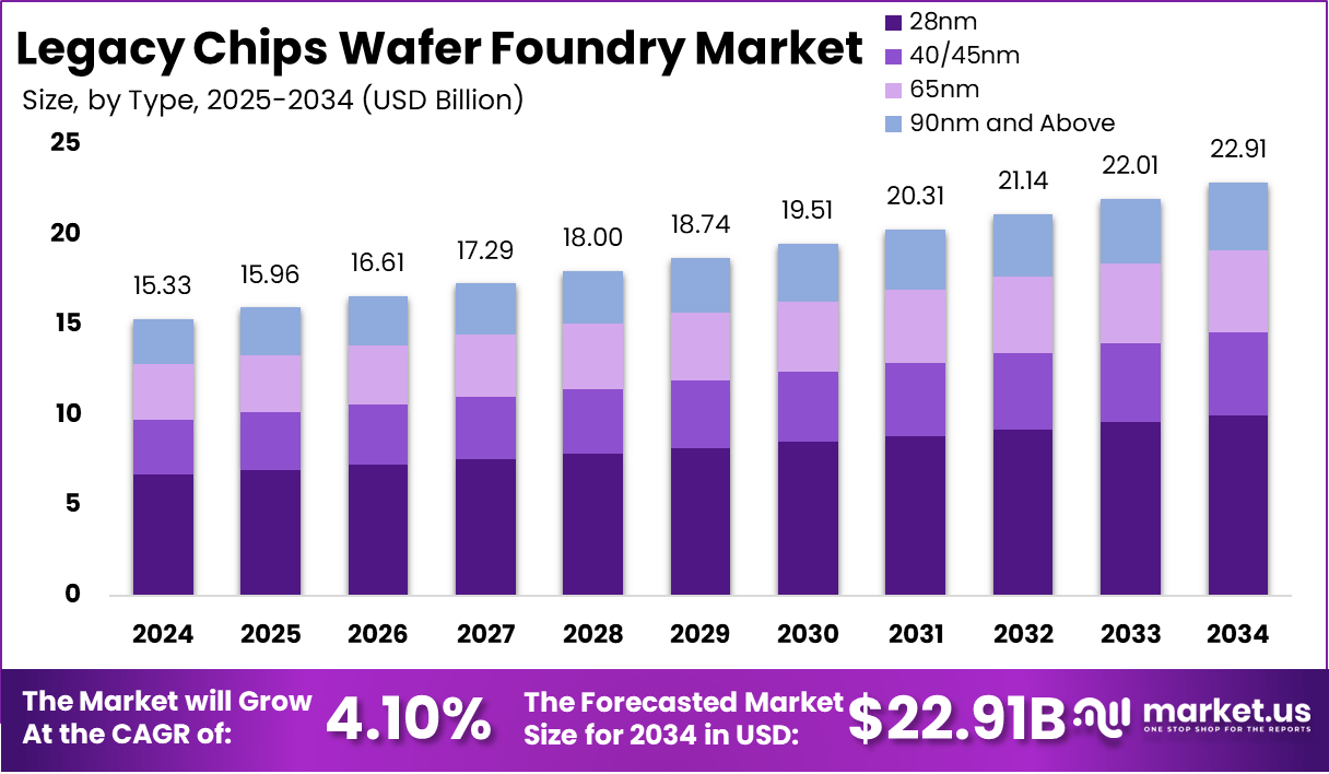- Market Value Growth: The legacy chips wafer foundry market is projected to grow from USD 15.33 billion in 2024 to USD 22.91 billion by 2034, reflecting steady market expansion.