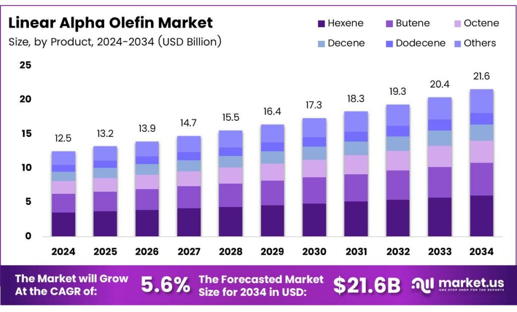 - The Global Linear Alpha Olefin Market is projected to grow from USD 12.5 billion in 2024 to USD 21.6 billion by 2034 at a CAGR of 5.6%.