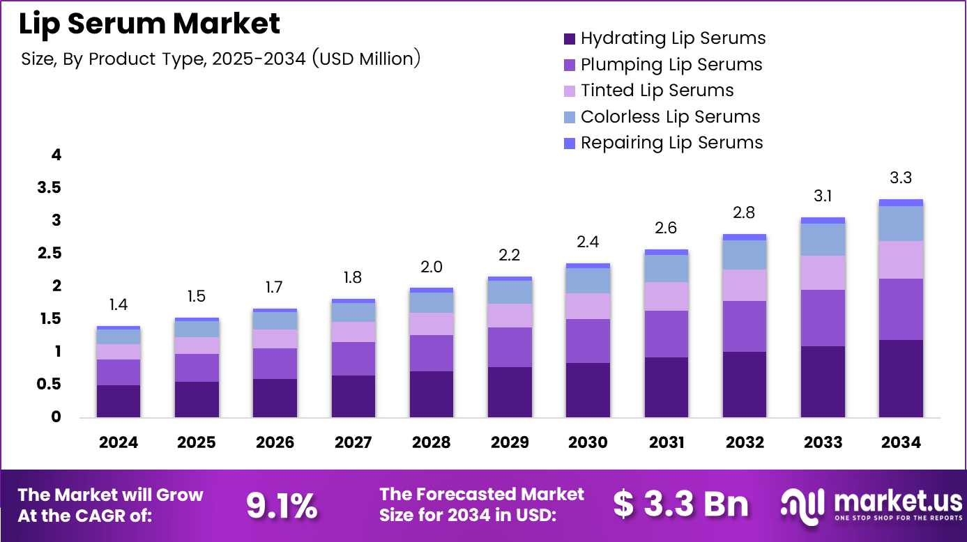 - The Global Lip Serum Market is projected to reach USD 3.3 billion by 2034, expanding from USD 1.4 billion in 2024 at a CAGR of 9.1%.