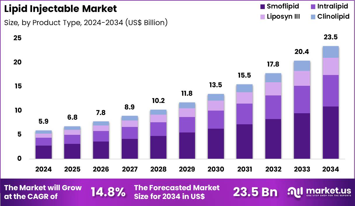 Report Features Description Market Value (2024) US$ 5.9 Billion Forecast Revenue (2034) US$ 23.5 Billion CAGR (2025-2034) 14.8 Base Year for Estimation 2024 Historic Period 2020-2023 Forecast Period 2025-2034 Report Coverage Revenue Forecast, Market Dynamics, COVID-19 Impact, Competitive Landscape, Recent Developments Segments Covered By Product Type (Smoflipid, Intralipid, Liposyn III and Clinolipid), By Application (Targeted Drug Delivery, Pain Reduction and Toxicity Reduction) Regional Analysis North America – US, Canada; Europe – Germany, France, The UK, Spain, Italy, Russia, Netherlands, Rest of Europe; Asia Pacific – China, Japan, South Korea, India, Australia, New Zealand, Singapore, Thailand, Vietnam, Rest of APAC; Latin America – Brazil, Mexico, Rest of Latin America; Middle East & Africa – South Africa, Saudi Arabia, UAE, Rest of MEA Competitive Landscape Baxter International Inc., Fresenius Kabi, B. Braun Melsungen AG, Grifols, S.A., Luitpold Pharmaceuticals, Inc., Teva Pharmaceutical Industries Ltd., Pfizer Inc., Aspen Pharmacare Holdings Ltd., Mylan N.V., Sandoz International GmbH Customization Scope Customization for segments, region/country-level will be provided. Moreover, additional customization can be done based on the requirements. Purchase Options We have three licenses to opt for: Single User License, Multi-User License (Up to 5 Users), Corporate Use License (Unlimited User and Printable PDF)