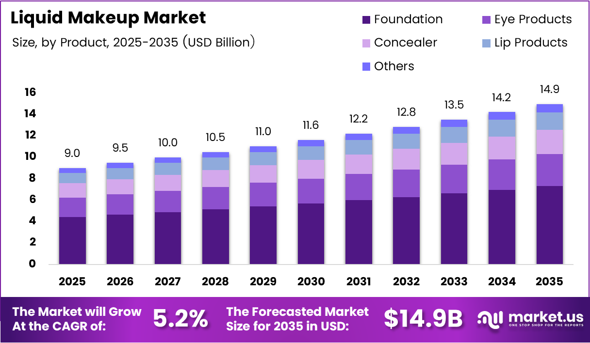 Global Liquid Makeup Market size is expected to be worth around USD 14.9 Billion by 2035 from USD 9.0 Billion in 2025, growing at a CAGR of 5.2% during the forecast period 2026 to 2035.