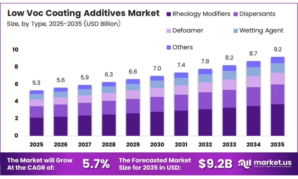 - The Global Low VOC Coating Additives Market is valued at USD 5.3 billion in 2025 and is forecast to reach USD 9.2 billion by 2035 at a CAGR of 5.7% during the forecast period 2026 to 2035.