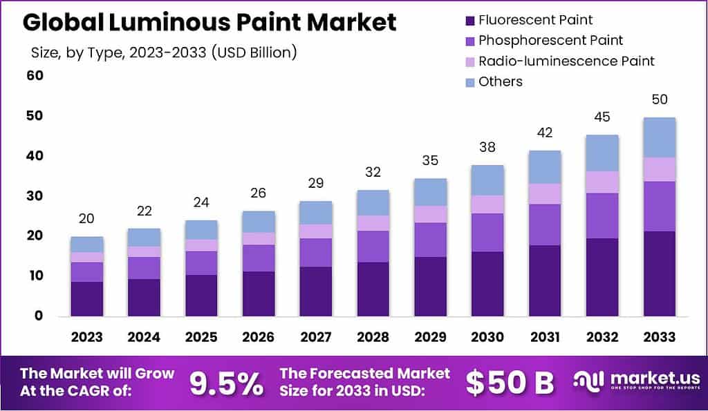 - The Global Luminary Paint Market is expected to be worth around USD 50.0 billion by 2033, up from USD 20.1 billion in 2023, and grow at a CAGR of 9.5% during the forecast period from 2024 to 2033.