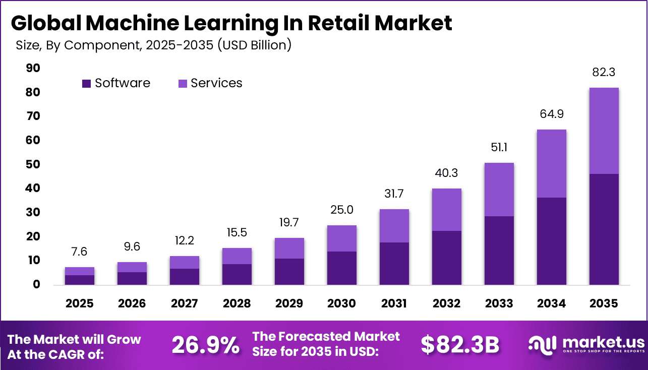 - In the machine learning in retail market, software accounted for 56.4%, showing strong demand for analytics and automation platforms.