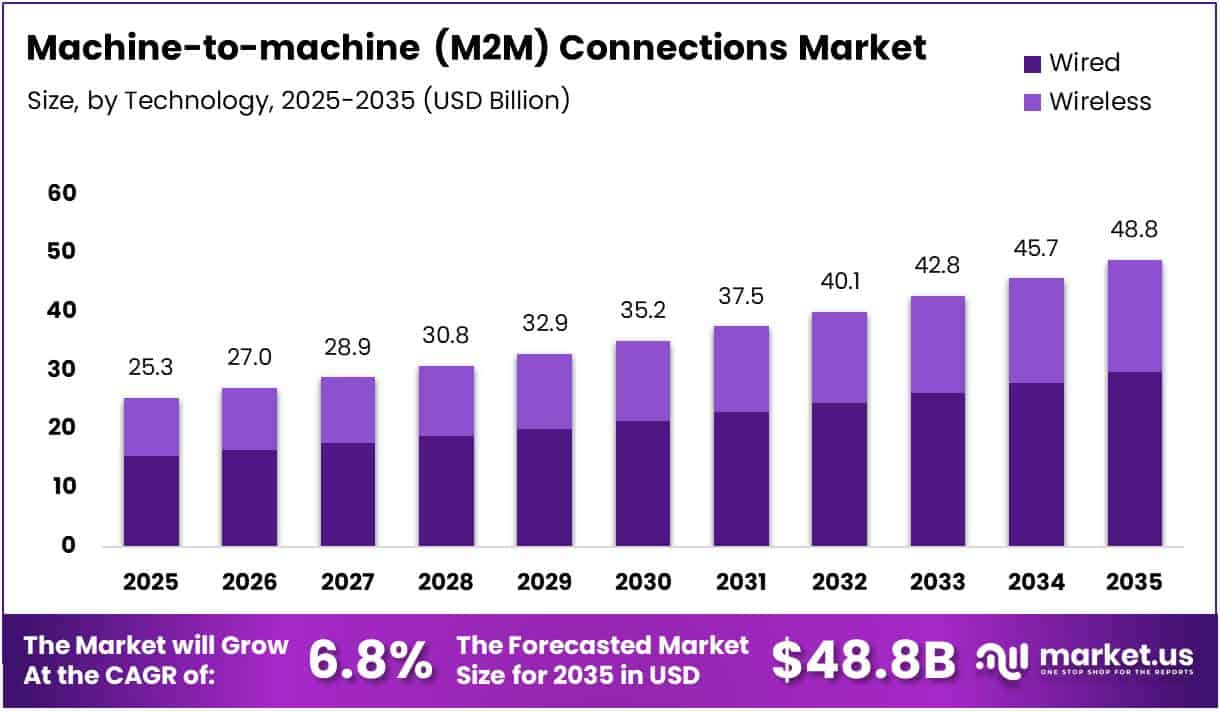 The Global Machine-to-Machine (M2M) Connections Market size is expected to be worth around USD 48.8 Billion by 2035 from USD 25.3 Billion in 2025, growing at a CAGR of 6.8% during the forecast period 2026 to 2035.