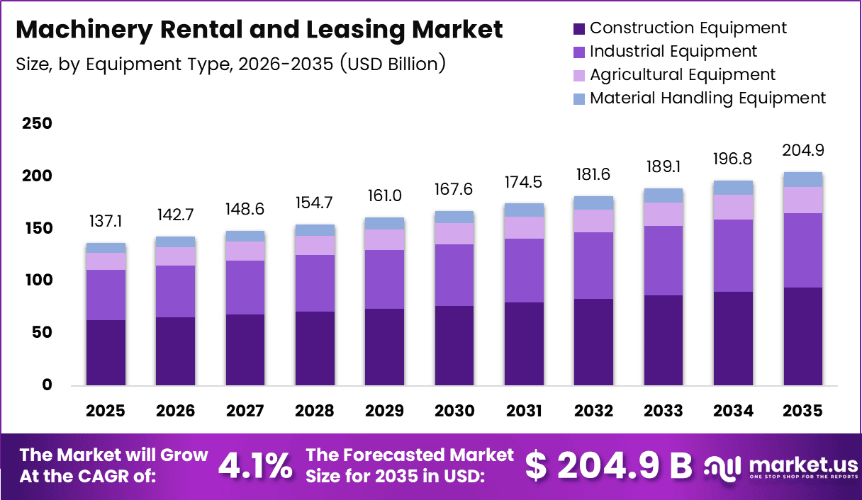 Global Machinery Rental and Leasing Market size is expected to be worth around USD 204.9 Billion by 2035 from USD 137.1 Billion in 2025, growing at a CAGR of 4.1% during the forecast period 2026 to 2035.