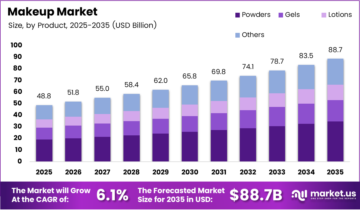 - The global makeup market was valued at USD 48.8 Billion in 2025 and is forecast to reach USD 88.7 Billion by 2035.
