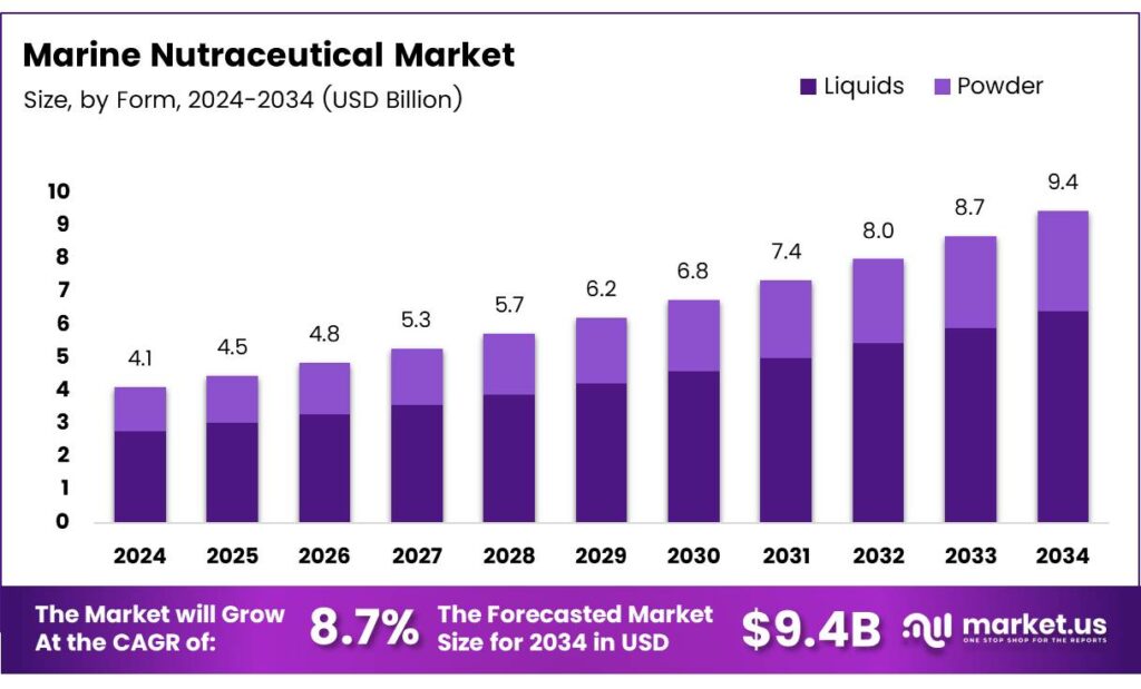 - The Global Marine Nutraceutical Market is projected to grow from USD 4.1 billion in 2024 to USD 9.4 billion by 2034, at a CAGR of 8.7%.