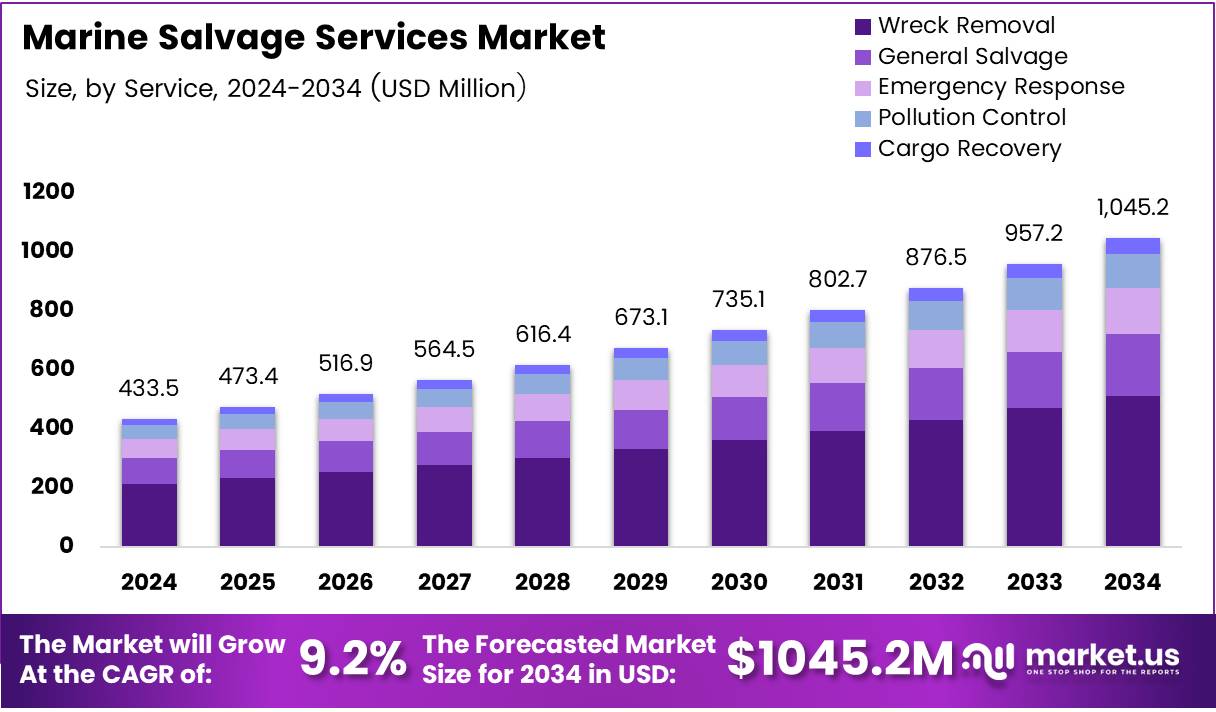 - Global Marine Salvage Services Market size is expected to reach USD 1045.2 Million by 2034, growing at a CAGR of 9.2% from 2025 to 2034.
