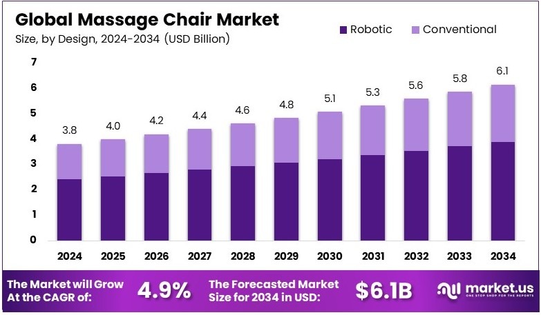 The Global Massage Chair Market size is expected to be worth around USD 6.1 Billion by 2034, from USD 3.8 Billion in 2024, growing at a CAGR of 4.9% during the forecast period from 2025 to 2034.