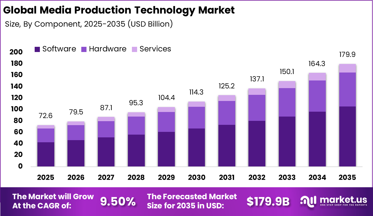 Software accounts for 58.7% of the media production technology market, highlighting its central role in content creation workflows. Editing, color grading, visual effects, and audio processing tools are essential for modern production environments.