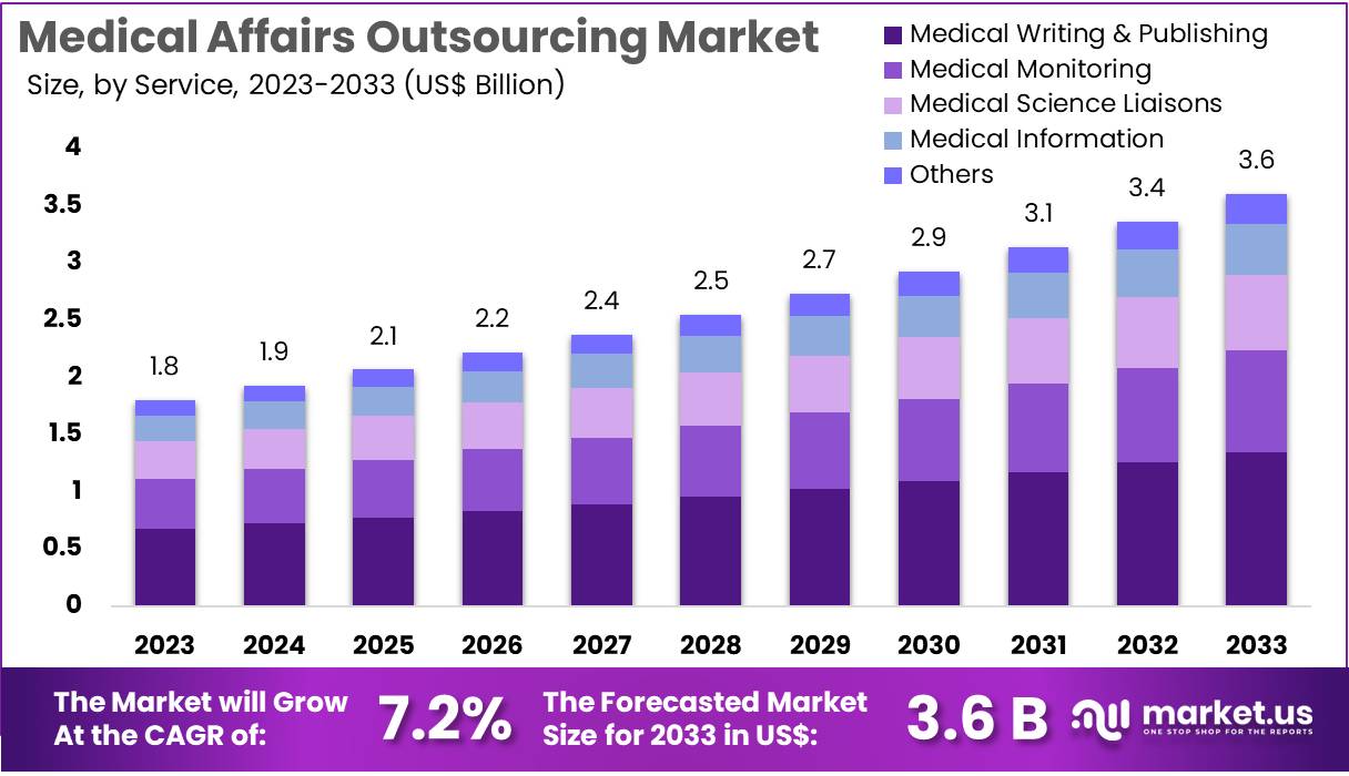 - In 2023, the market for medical affairs outsourcing generated a revenue of US$ 1.8 billion, with a CAGR of 7.2%, and is expected to reach US$ 3.6 billion by the year 2033.
