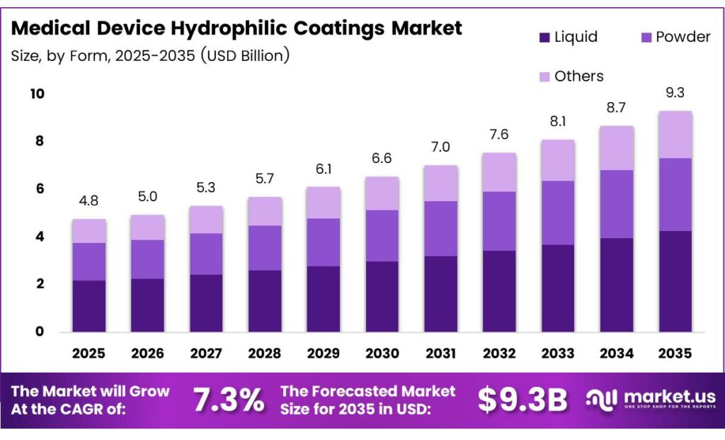The Global Medical Device Hydrophilic Coatings Market size is expected to be worth around USD 9.3 billion by 2035 from USD 4.8 billion in 2025, growing at a CAGR of 7.3% during the forecast period 2026 to 2035.